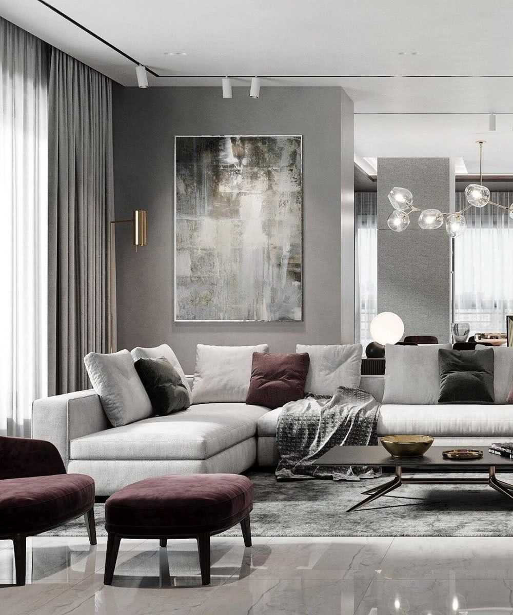 Если гостиная отличается красивым лаконичным современным убранством, дополнить его можно текстилем средней плотности, чистых бежевых, белых, песочных тонов. Необычные подходящие новинки – двойные портьеры, пошитые из тканей двух цветов.