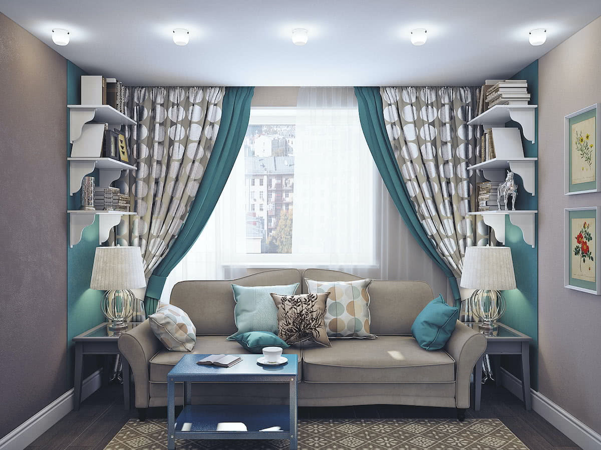 Чаще всего шторы в гостиной занимают большую часть стены, поэтому они закрывают цвет обоев или краски