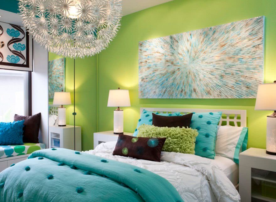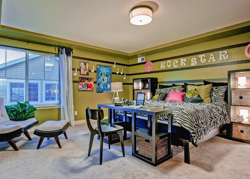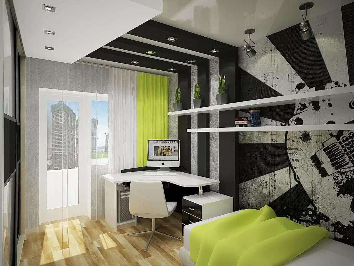 Общие рекомендации говорят о том, что использование агрессивных оттенков в комнате подростка не рекомендовано. Можно оформить в стиле крутого модерна с зелеными и бежевыми тонами.