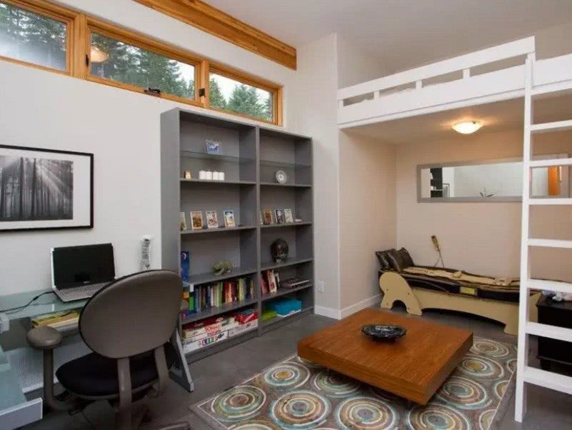Трудно представить гостевую зону без мягкого дивана и столика. По мнению психологов, не стоит слишком отдалять гостевую зону от рабочей, так как учебники и компьютер вполне могут являться частью общих интересов. Учитывая этот факт, один и тот же стол можно использовать и для рабочей, и для гостевой зоны.