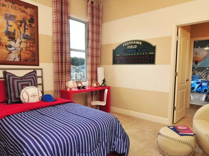 Интересным будет дизайн, основанный на увлечениях, интересах, способностях подростка. Сегодня распространен тематический дизайн подростковых комнат. Для любителей спорта это может быть футбольная, баскетбольная тематика на стенах и в мебели. Производители предлагают мебель с разными спортивными принтами, на заказ выполнят кровать и шкаф любых размеров и форм. На стене можно разместить импровизированные футбольные ворота или фотографии великих игроков. Любителю бокса повесить «грушу» для тренировок. Если ребенок делает успехи в спорте, обязательно выделите полку для его победных трофеев. Медали и кубки – гордость любого мальчишки.