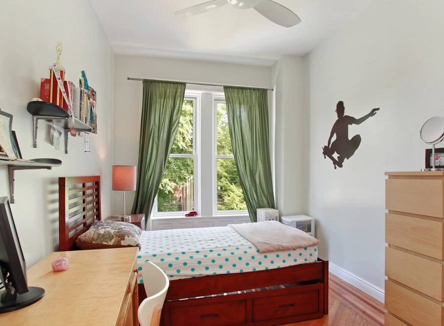 На пол в подростковой комнате смело клади ламинат, но выбирай коллекцию с высоким классом износостойкости. Его плюс – практичность, долговечность и большое разнообразие оттенков с фактурами. Чтобы по покрытию было комфортно ходить босиком, позаботься о системе теплого пола или положи небольшой коврик у кровати.