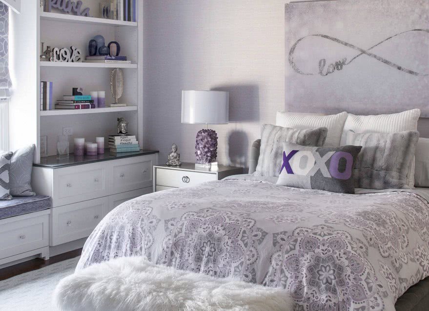Отделка в нежных кремовых и бледно-сиреневых тонах, создающая в спальне для девочки-подростка на фото уютную атмосферу, – лучшее решение для легкого неоклассического интерьера. Она подчеркивает изящество обстановки и на ее фоне выигрышно смотрится белая мебель, золотистые аксессуары и светильники с каркасом цвета латуни.