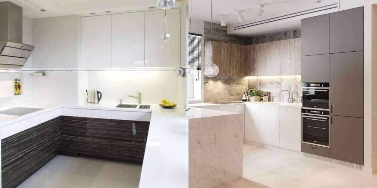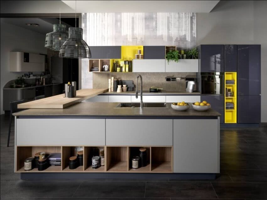 Модные угловые кухни 2021 – 2022 года позволяют сделать дизайн более эргономичным и поместить много принадлежностей. Один из самых ярких примеров — П-образный гарнитур с полуостровом или барной стойкой.