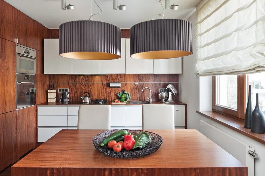 Вместо высокого блеска предлагается матовое покрытие – на всех возможных поверхностях кухни. Это практично, потому что вы не видите на них грязи. Эти элементы объединяются с другими – отражающими свет, например, раковиной или лампой. Они все еще популярны – медь, золото и полированная или матовая латунь. Ручки, абажуры, розетки и выключатели, а также кухонная фурнитура этих цветов, в правильной комбинации, будут вписываться в современные модные тенденции.