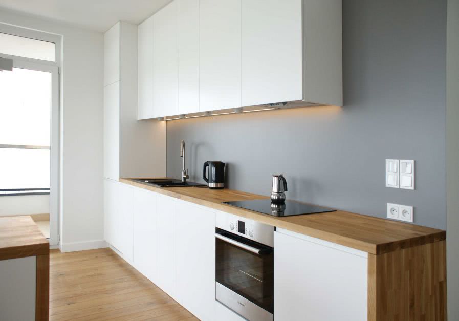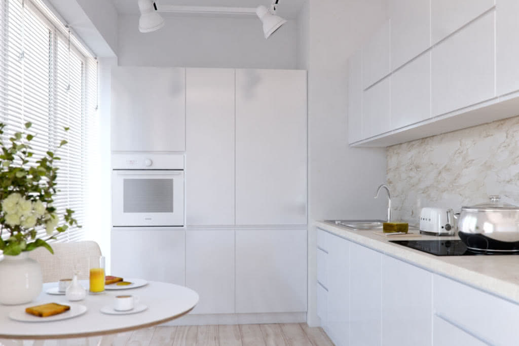 Еще одна модная тенденция — отказ от навесных шкафов. Правда, для маленькой кухни она подходит, только если хозяева крайне редко бывают дома и готовят там еду лишь от случая к случаю.