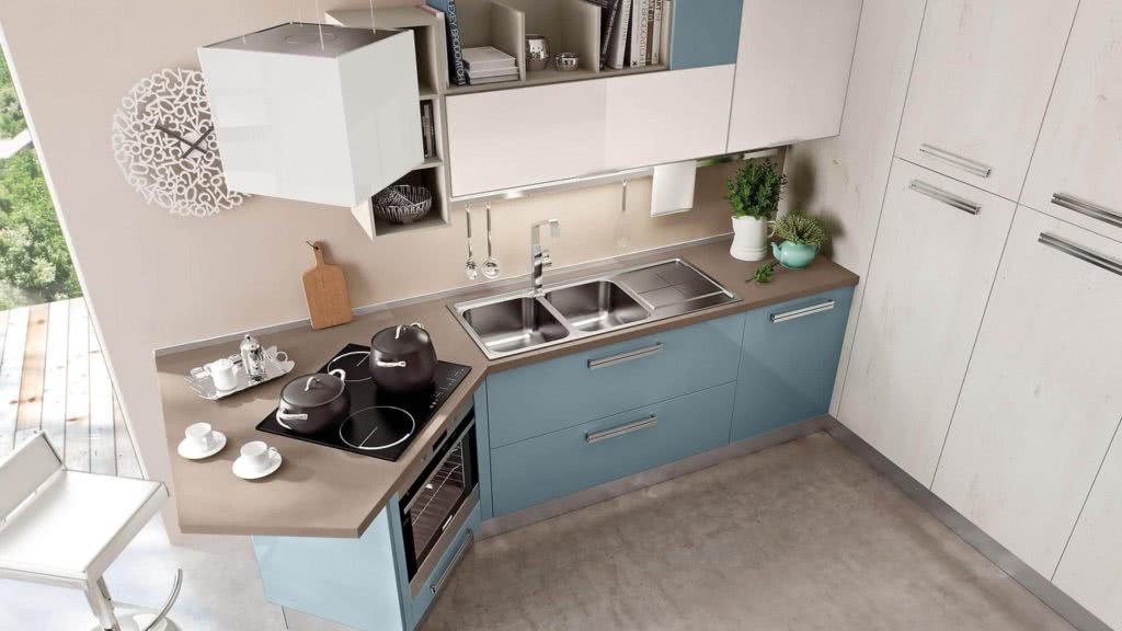 Угловая кухня популярна при благоустройстве интерьера. Подходит для маленькой площади. Гарнитур дополняют островом, рядом вместительных шкафов вдоль противоположной стены. Дизайн, подразумевающий применение скошенного угла, хорош при угловой мойке.