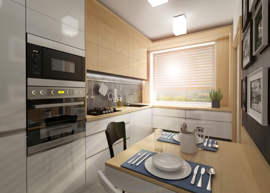 Еще одна относительная новинка в планировке, позволяющая создать эргономичный дизайн маленькой кухни 2021 — использование пространства под окном.