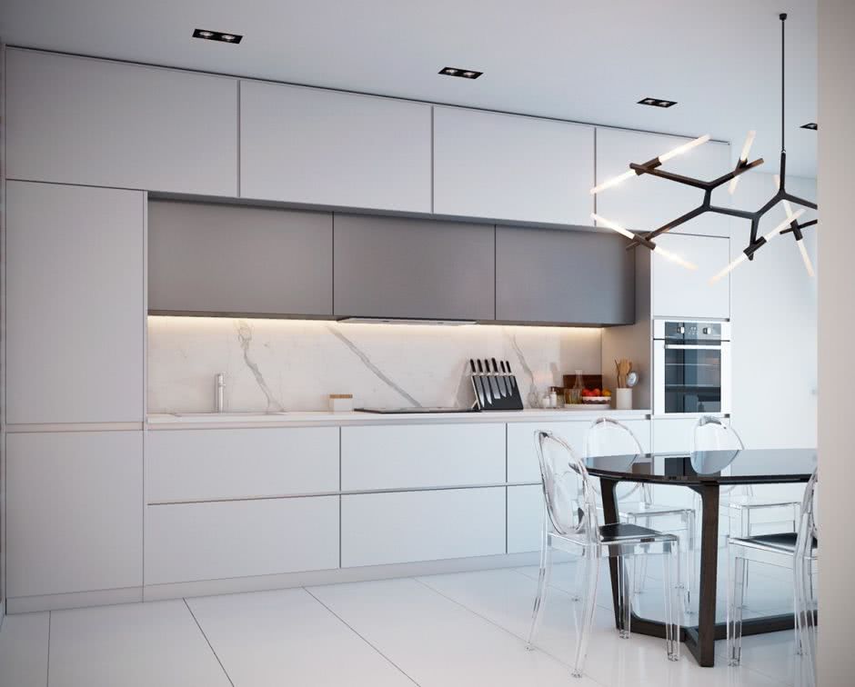 Холодные оттенки. Особенно модные в дизайне современной кухни белый, тёплый и холодный серый, серебристый, черный. Они считаются к тому же базовыми. Поэтому к гарнитурам в таких оттенках можно смело подбирать акцентные предметы интерьера в любом цвете.