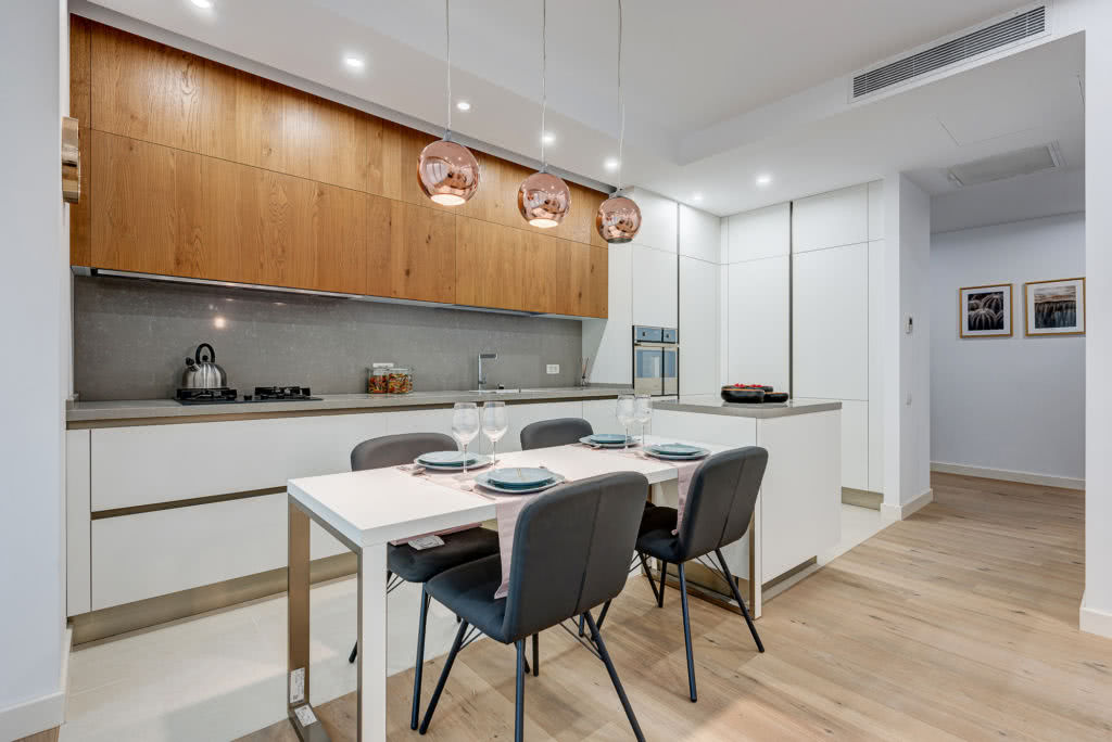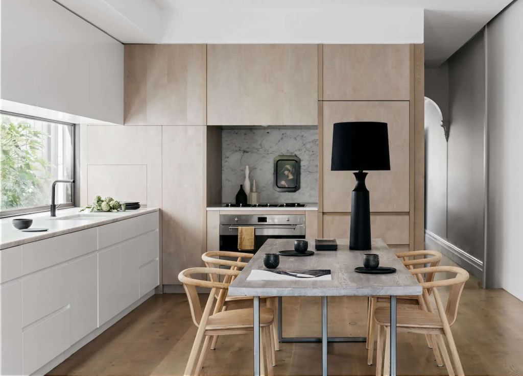 Минимальное количество фурнитуры. Все выступающие элементы заменяют скрытыми каналами. Теперь кухонная мебель представляет собой сплошной остров без вычурных деталей.