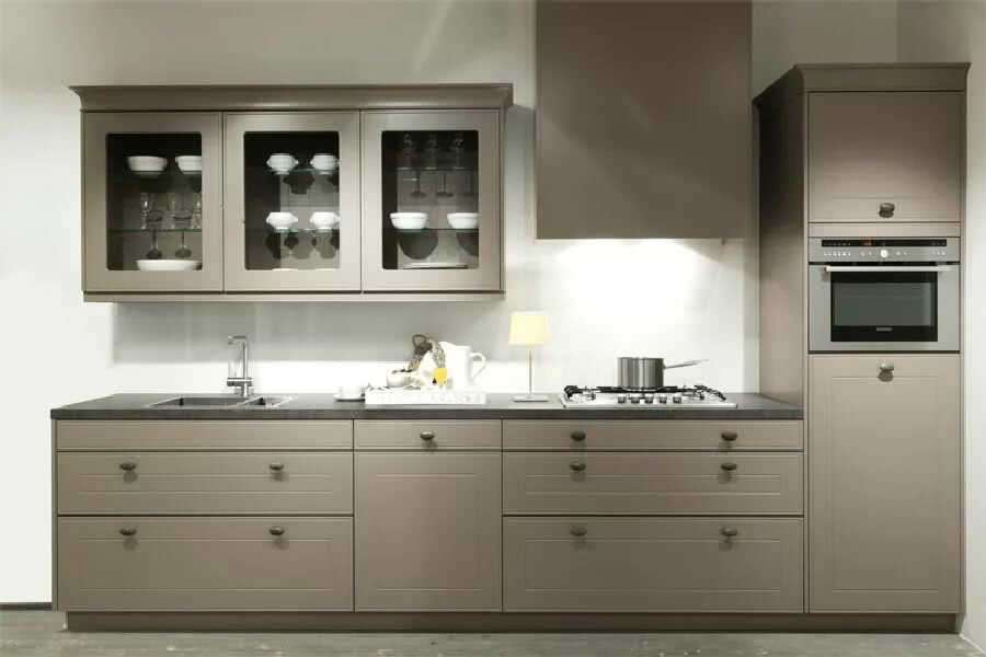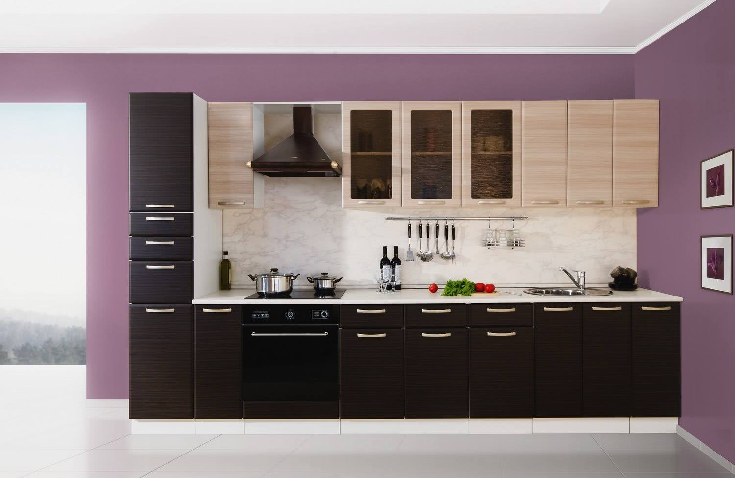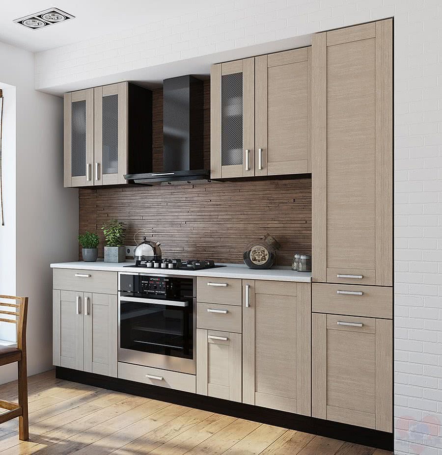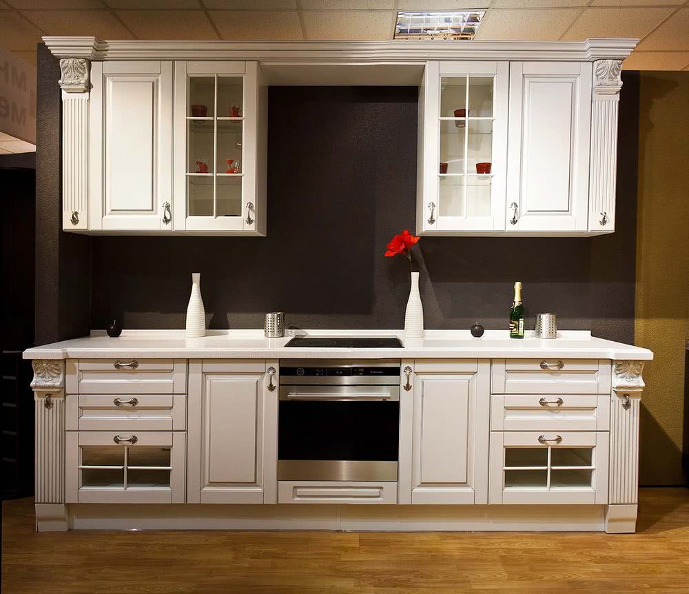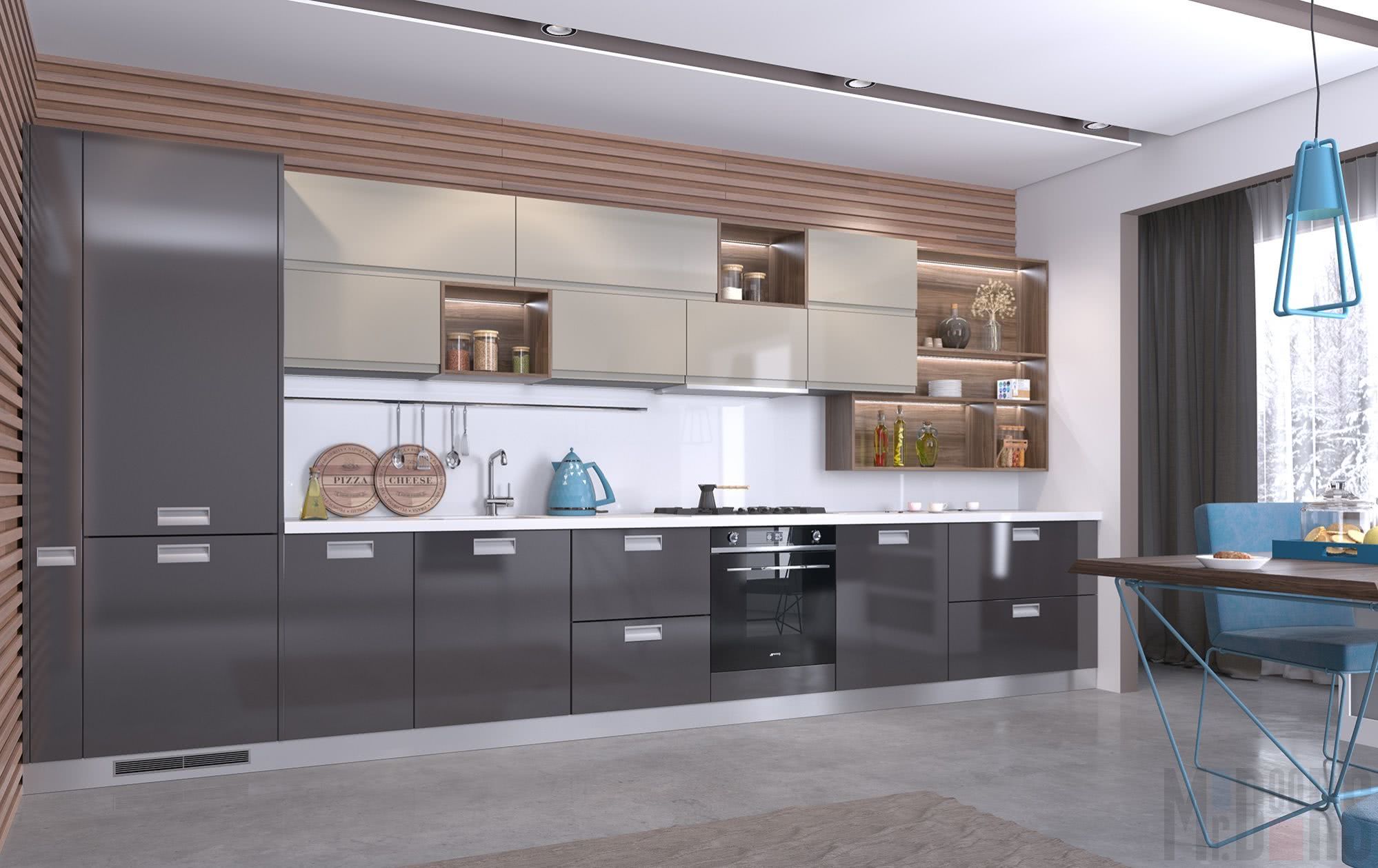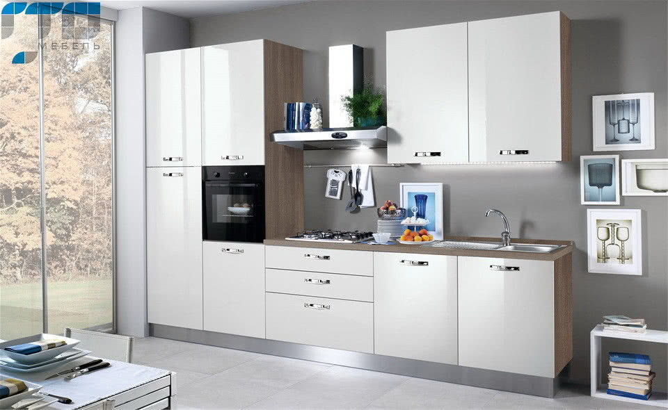 - Удобство. Лаконичное расположение всех модулей на одной прямой позволит быстро ориентироваться и находить нужные предметы и посуду. При этом достаточное количество модулей позволит разместить все необходимое для процесса готовки пищи и сервировки стола.