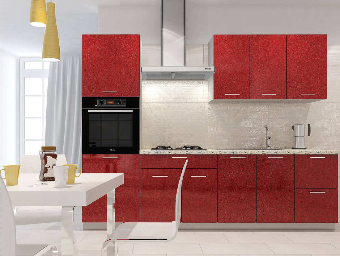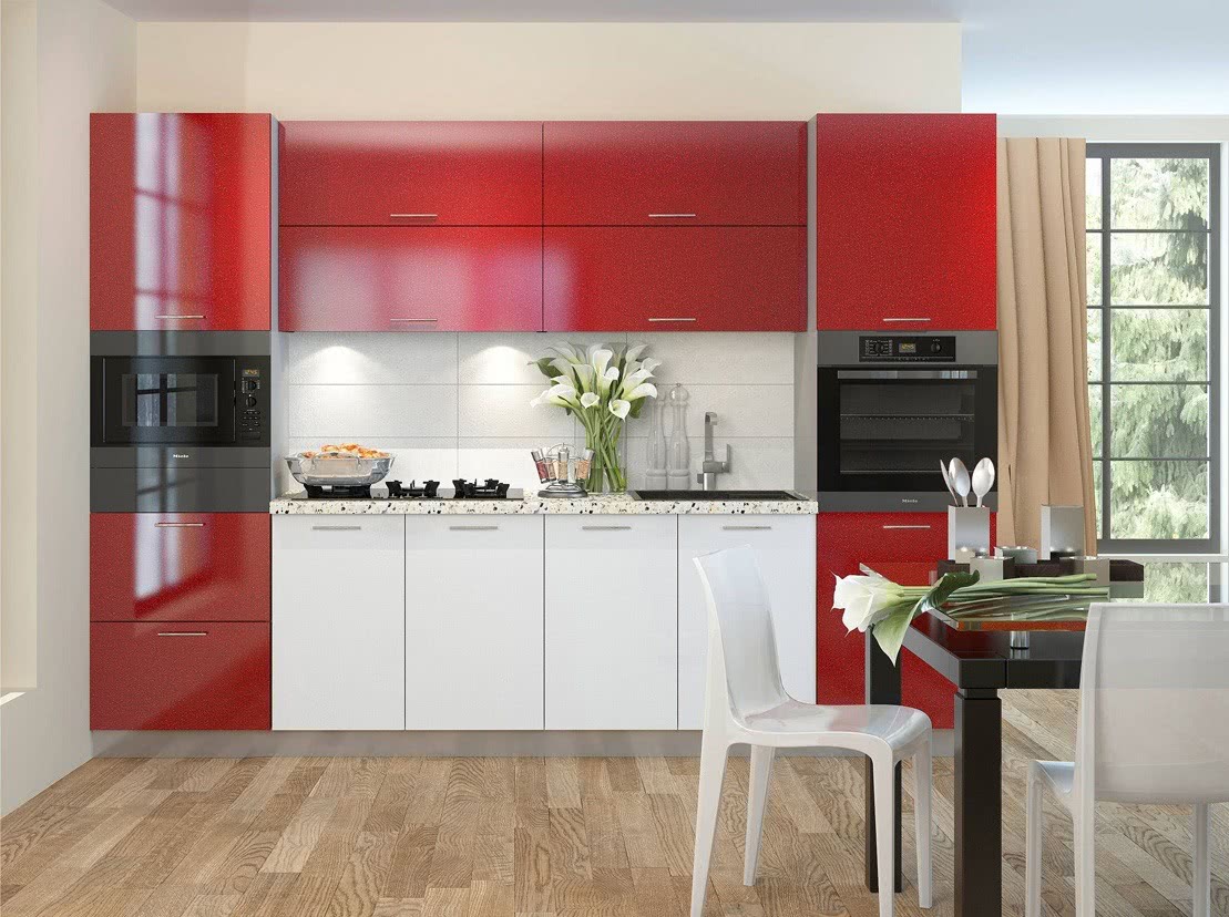 Красный. Яркий глянцевый кухонный гарнитур является мечтой многих хозяек. Такая мебель точно не останется без внимания, но при этом она создаст неповторимый стиль помещения. Энергетика красного цвета поднимает настроение и придает бодрости, но при этом комната может выглядеть несколько агрессивно