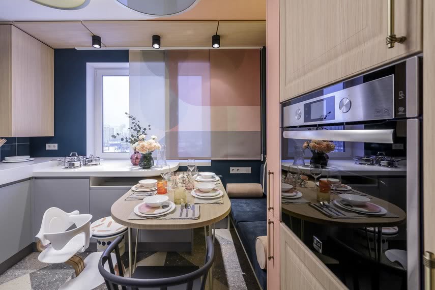 Тогда получится небольшое пространство для приготовления и достаточно просторное для приема пищи. Кстати, надо отметить, что приготовление пищи не всегда должно занимать огромное рабочее место. Достаточно содержать его в чистоте и максимально рационально использовать каждый полезный сантиметр площади.