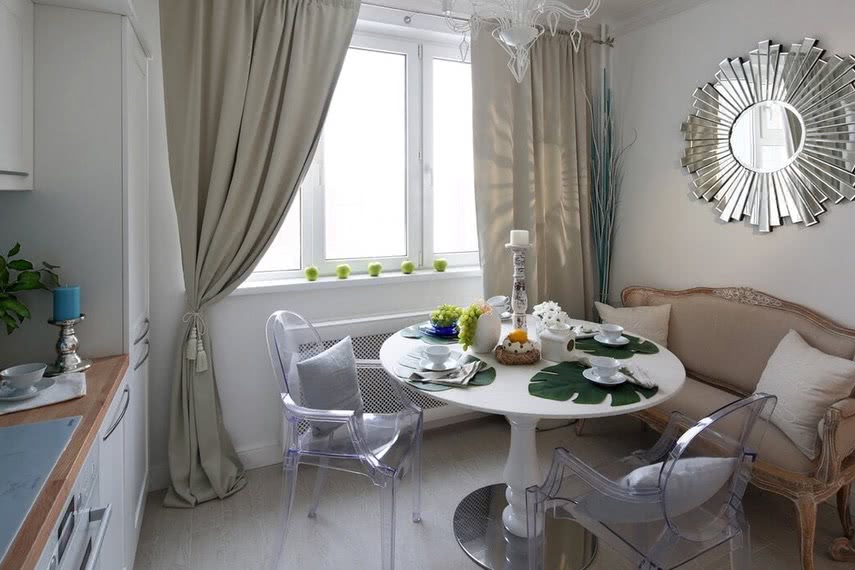 Круглый стол занимает меньше места, чем прямоугольный. К тому же он смотрится изысканнее. Визуально расширить пространство может стеклянная столешница и пластиковые прозрачные стулья. Стулья должны подходить к обеденному столу, составляя единую с ним композицию.