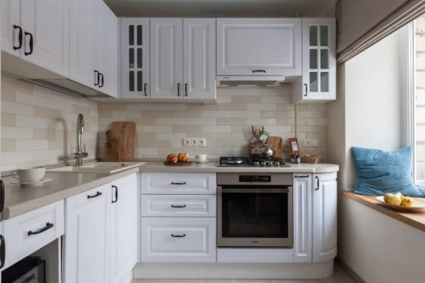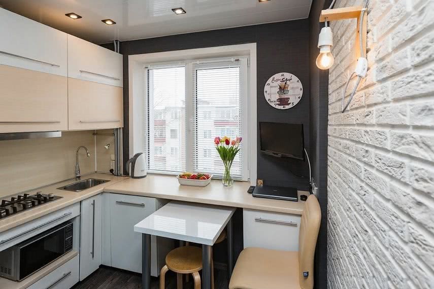 Во-первых, рабочую зону можно неплохо организовать П-образно. То есть основную столешницу, например, сделать на уровне подоконника, под ней вынести удобные шкафы для хранения. По бокам использовать бытовую технику и мебель.
