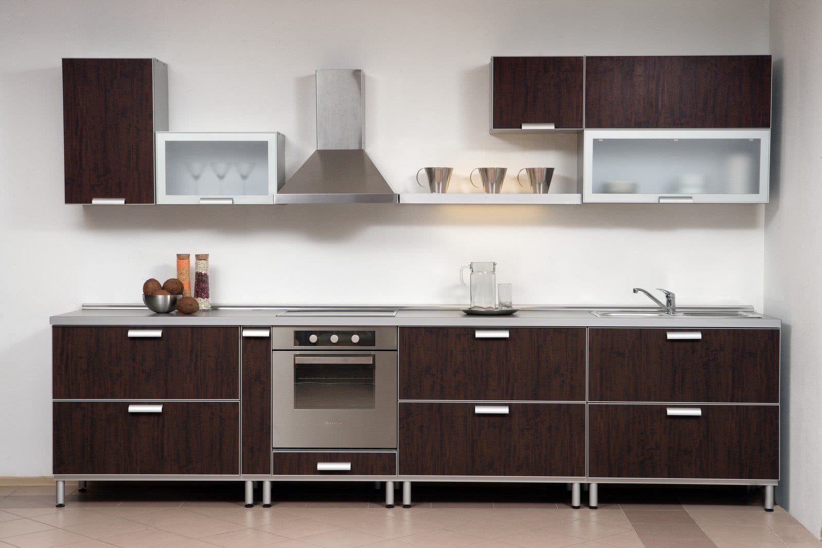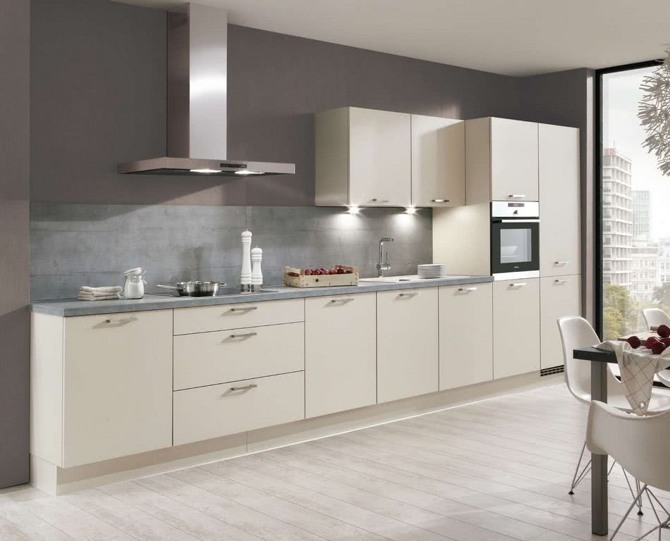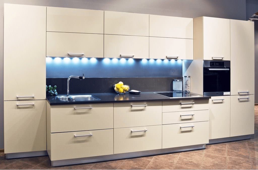 Кухонная мебель будет смотреться красивее на фоне нейтральных стен. Чаще для отделки используются светлые стальные, белые, светло-коричневые цвета. Если прямолинейная кухня планируется с целью экономии места, тогда следует отказаться от излишне черных и ярких цветов. Для подчеркивания лаконичного внешнего варианта мебели используются те же тона, что и в отделке фасадов.