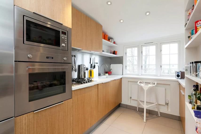 Для кухни два на три метра подбирается гарнитур прямой или угловой формы и компактных размеров. От лишней кухонной утвари владельцам квартиры придётся отказаться.