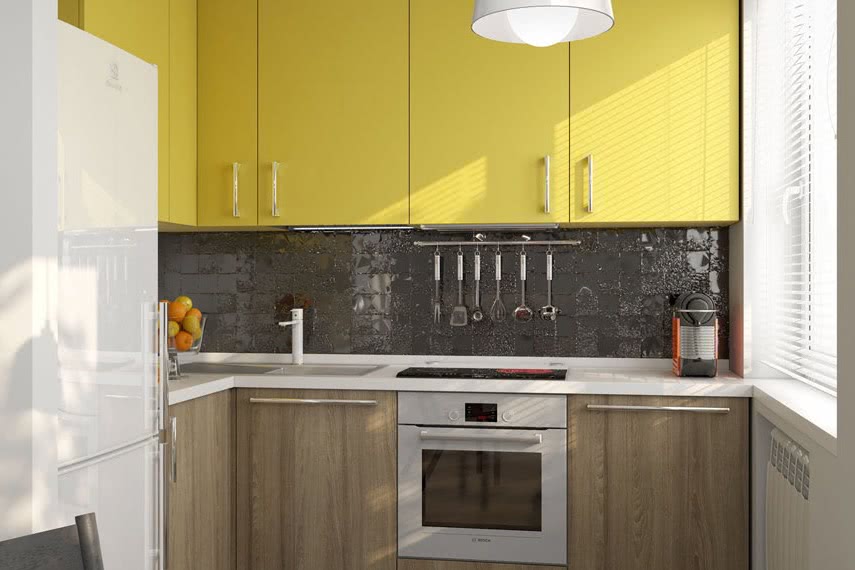 Желтый. Теплый и жизнерадостный оттенок отлично подходит для кухни с недостатком освещения, он как будто заменяет солнце и согревает окружающее пространство. Если комната находится на северной стороне, то сделать ее более светлой и уютной поможет оформление стены у окна в желтый цвет. В небольших помещениях лучше не использовать слишком много подобных оттенков, чтобы не уменьшать визуально размеры комнаты. Желтыми можно сделать фасады гарнитура, а стены оставить светлыми или белыми. Это позволит не перегружать пространство.