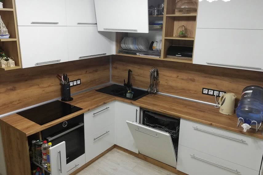 При выборе такого варианта нужно обратить внимание на компактность размещения рабочей зоны и удобство при приготовлении пищи.