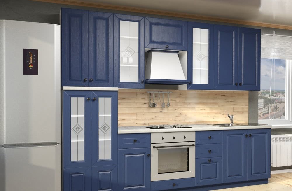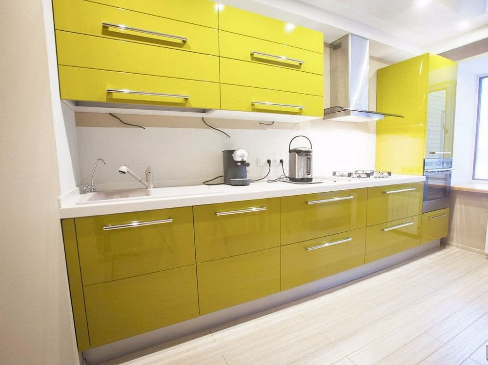 Прямой гарнитур более подойдёт для кухни с вытянутой и удлинённой планировкой, имеющей выход на лоджию, балкон, другие дверные проёмы, препятствующие размещению нелинейной мебели.