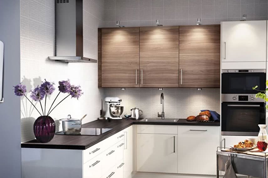 Хорошее освещение очень важно для кухни, особенно актуально для территории над столешницей, поэтому здесь можно установить дополнительные мощные светильники. Часто встречается вариант размещения по периметру потолочной поверхности системы точечных светильников, спотов, которые удачно заменяют громоздкие люстры и распространяют превосходный поток света по всей площади