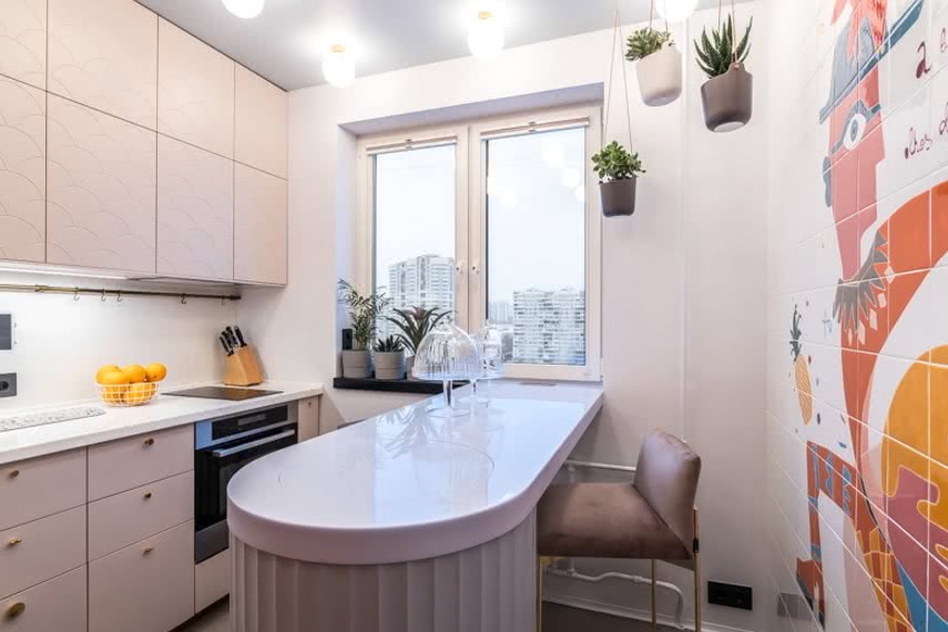 Конечно, это может быть интересный вариант, если расположить его у окна. Тогда гораздо приятнее находиться за стойкой. Но в маленькой кухне — это вполне грамотная экономия пространства. Тем более, что барная стойка на всю стену, не такая уж и широкая, в отличие от стандартного обеденного стола. К тому же она может стать дополнительной рабочей областью, например, если планируется приготовление пищи на какой-либо праздник.