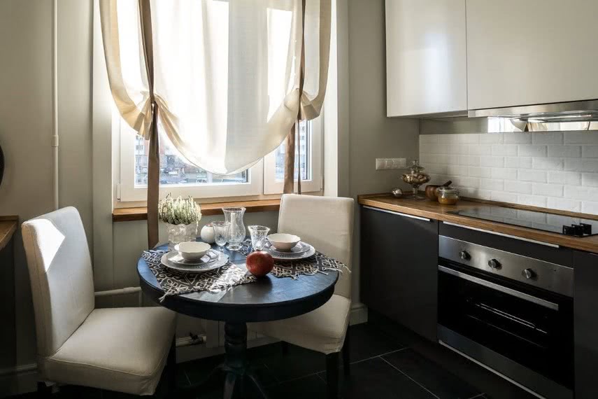 Удобно, когда в кухне есть полноценный обеденный стол, но если он занимает слишком много места и мешает свободному передвижению хозяйки, то заменить его можно менее громоздкой конструкцией: