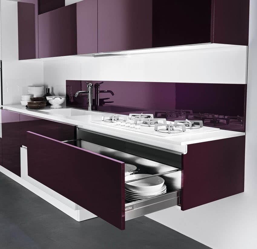 Фиолетовый. Подобная расцветка становится все более популярной в оформлении кухни. Магический оттенок особенно понравится творческим людям, поскольку он способен приносить вдохновение и настраивать на нужный лад. Не стоит выбирать глубокие темные тона для небольшой кухни, лучше остановить свой выбор на светлых вариантах цвета. Сиреневые и пастельные фиолетовые оттенки прекрасно сочетаются со многими другими расцветками.