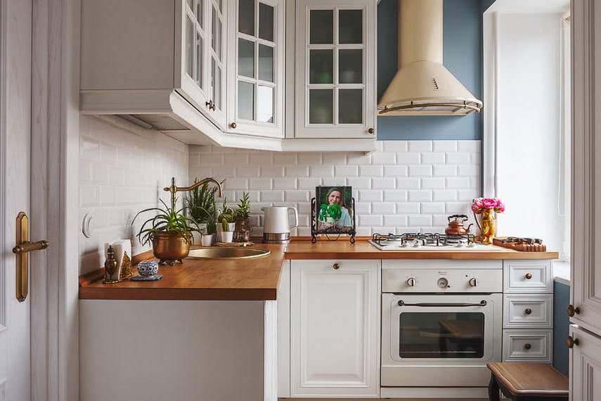 Прованс. Гармония французской деревни прекрасно подходит для небольшой кухни в современной квартире. Для такого стиля характерны светлые оттенки, прозрачные шкафы, открытые полки, множество аксессуаров, старинная мебель из дерева, разнообразный текстиль и хорошее освещение. Керамические статуэтки, изящные часы, букеты цветов и фотографии в рамках дополнят уютный вид помещения.