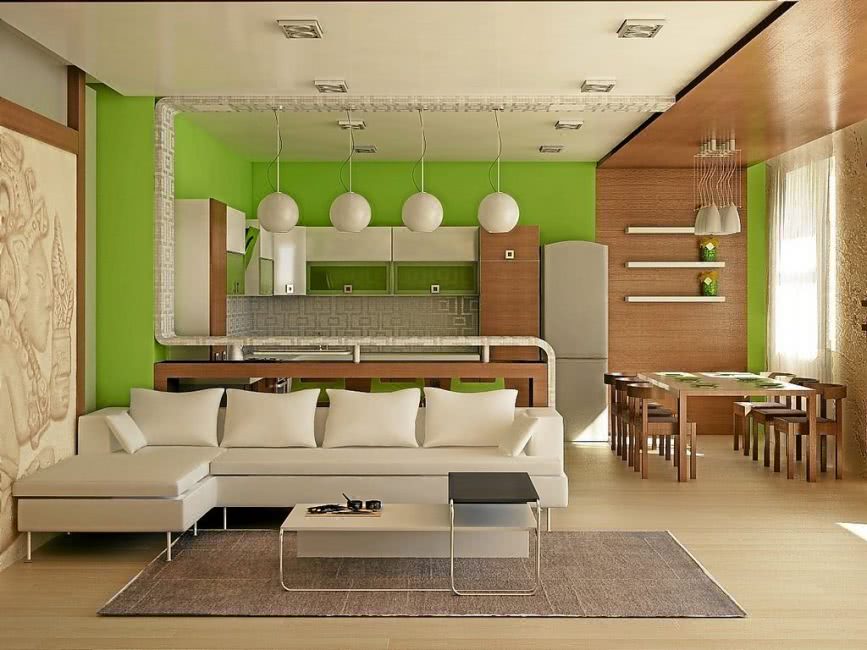 Наиболее популярными приемом разделения пространства является создание «кухонного острова». Он подразумевает частичное перекрытие пространства комнаты барной стойкой или же разделение цветов. При выборе оттенков необходимо помнить, что они должны сочетаться друг с другом, так как в противном случае помещение будет выглядеть отталкивающе.