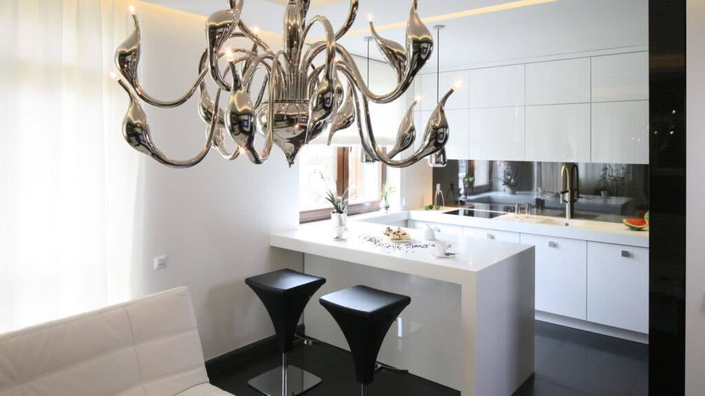 Также существует и масса других дизайнерских решений, которые смогут помочь в зонировании пространства на кухне. Один из них – создание разного освещения. Это деликатный метод, который более всего подходит именно для маленького метража. Свет не будет слишком сильно дробить помещение и уменьшать его визуально, но позволит создать два смысловых центра – непосредственно гарнитур и барную стойку. Можно повесить одну люстру, но сделать дополнительную подсветку на гарнитуре и у барной стойки. Это смотрится очень красиво и способствует структурированию пространства.