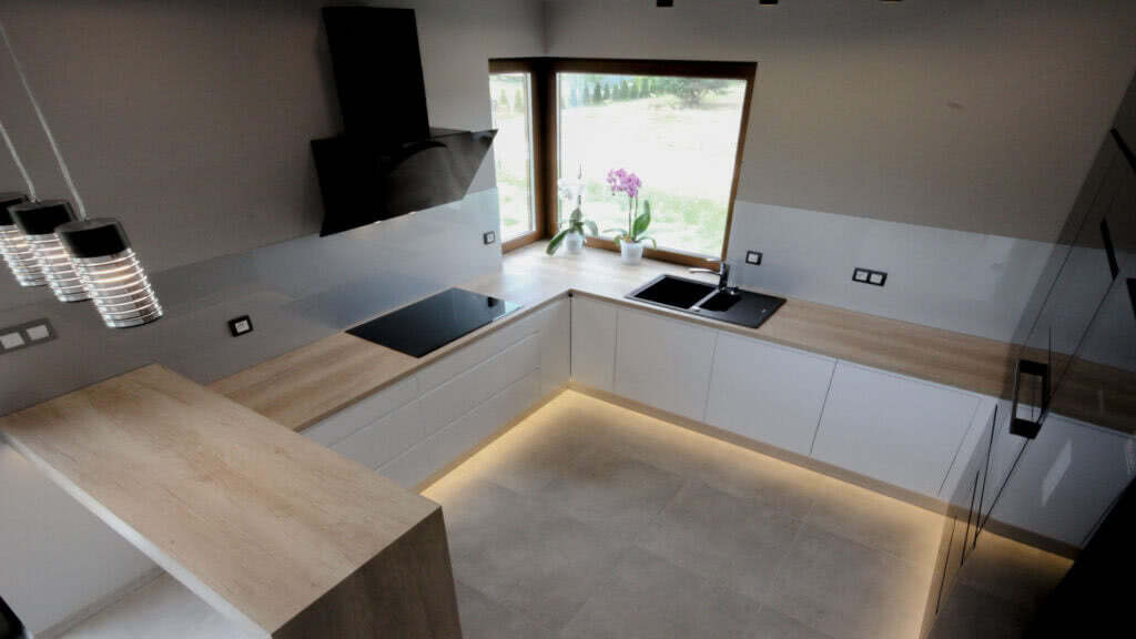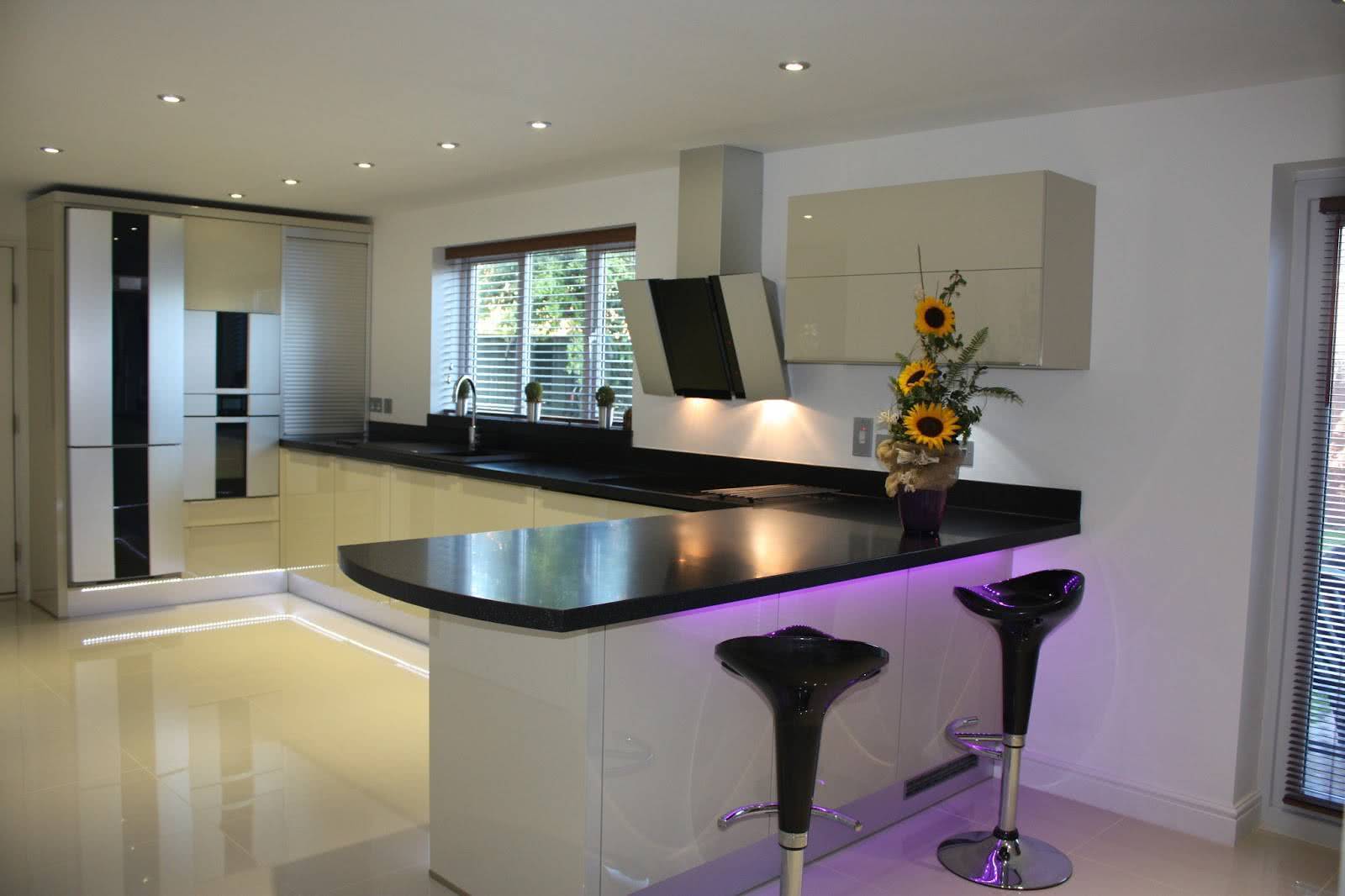Для кухонь в современном стиле вы можете использовать светодиодную ленту — она придаст интерьеру некий налет фантастичности и красиво подсветит барную стойку. Интересное решение — скрытая подсветка под парящим потолком. Толку от такого освещения немного, но смотрится красиво.