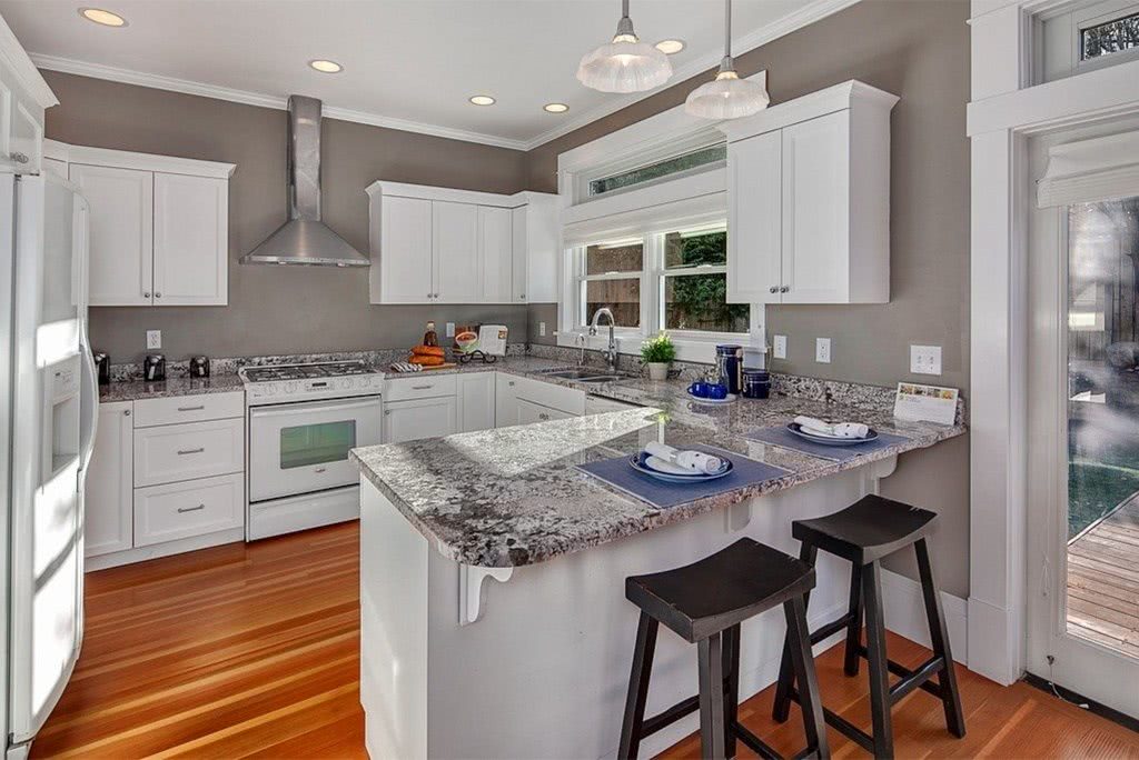 В отличие от предыдущего варианта, данный вид состоит из двух частей. Одна из них используется, как барная стойка, а другая, как рабочая поверхность. Такое решение определенно подходит для просторной кухни и обеспечивает оптимальное использование пространства.