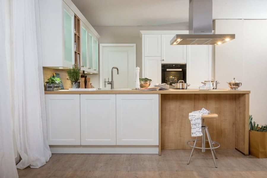 Встроенная в гарнитур – стойка, встроенная в Г- или П-образный гарнитур и переходящая в кухонную столешницу. При этом она может размещаться и у окна, и вдоль стены, использоваться и как полуостров, и как дополнительная рабочая поверхность.