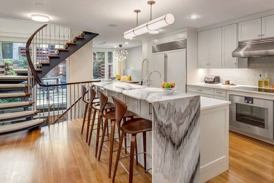 Стилевое направление модерн допускает наличие разных материалов для мебели – натуральные, синтетические, комбинированные. Обустройство кухни близкое к минимализму с акцентами. Элементы роскоши – нормально для модерна. Поэтому столешница гарнитура и барной стойки из натурального камня или массива придется к месту. Цветовая палитра обширная – теплые оттенки гармонично сочетаются с холодными, блеклые с яркими.