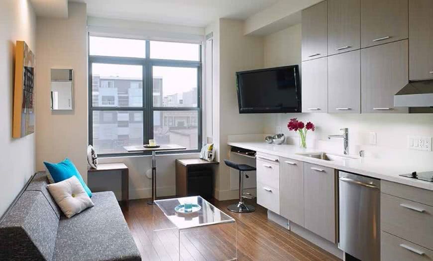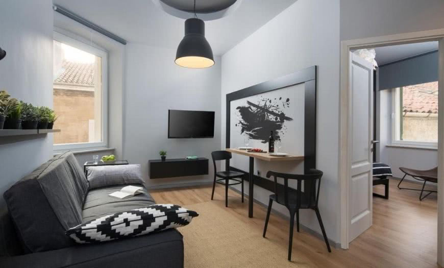 Наличие холодильника, плиты, стола/барной стойки и фартуха будет вполне достаточно, чтобы изредка что-то приготовить и покушать в домашних условиях. Это рациональное решение, так как площадь кухни можно перенести в пользу гостиной.