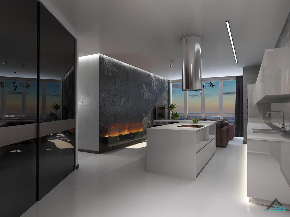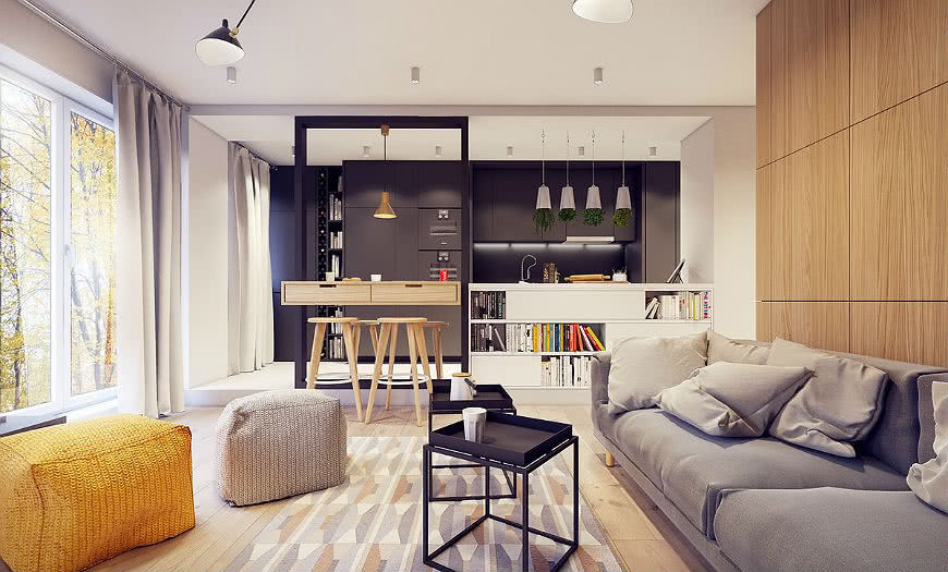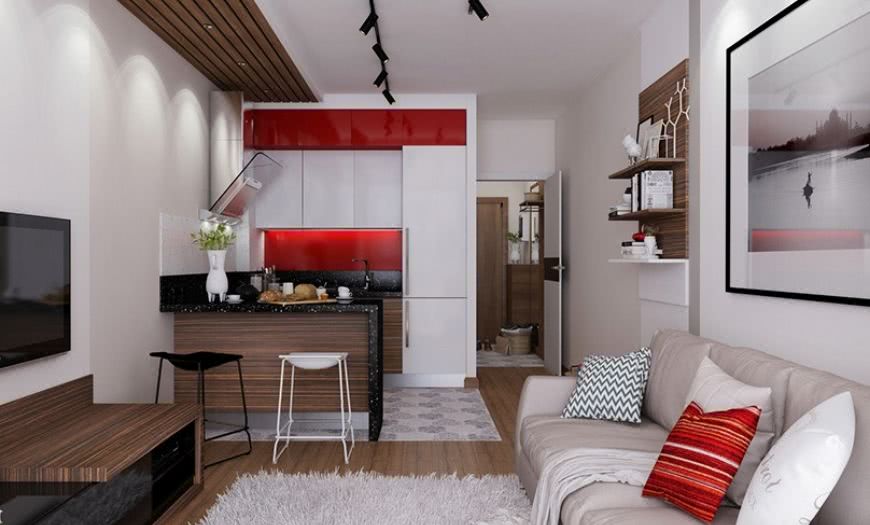 Хоть она и является частью гостиной, но ей нужно уделить особое внимание. Если жильцы пользуются кухней редко и часто питаются вне дома, тогда она должна формально присутствовать, но не быть полноценно функциональной