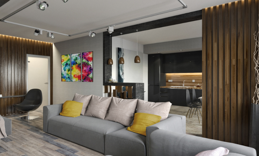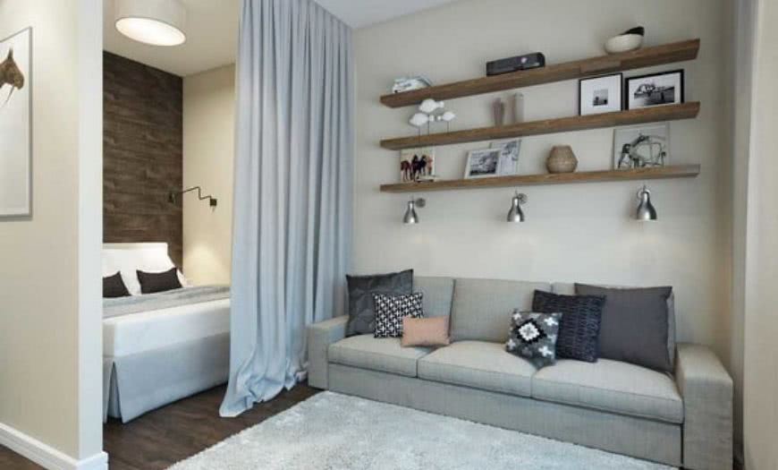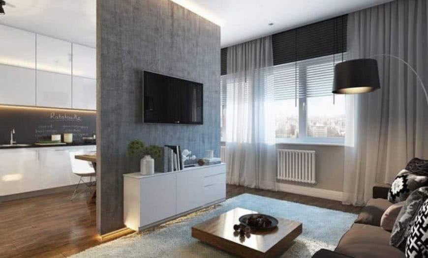 Для реализации дизайна стандартной однокомнатной квартиры, особенно в старых зданиях советского типа, может потребоваться перепланировка, но современный тренд не нацелен на создание полностью открытого пространства. Зонирование осуществляется не только за счет отделки и декора, но и с помощью создания ниш и изолированных друг от друга участков.