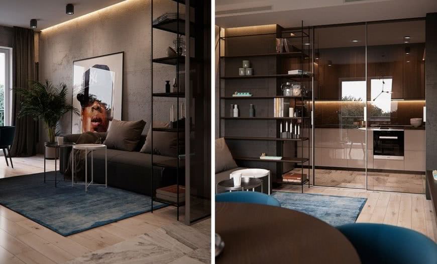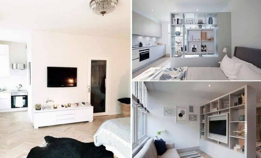 Это особый вид жилья, и применять к нему общие схемы не всегда разумно. В 2017 году в студиях рекомендуется использовать как можно больше перегородок, которые не только визуально делят пространство, но и, к примеру, мешают проникновению посторонних запахов из кухонной в жилую зону.