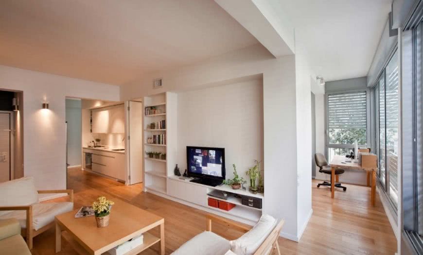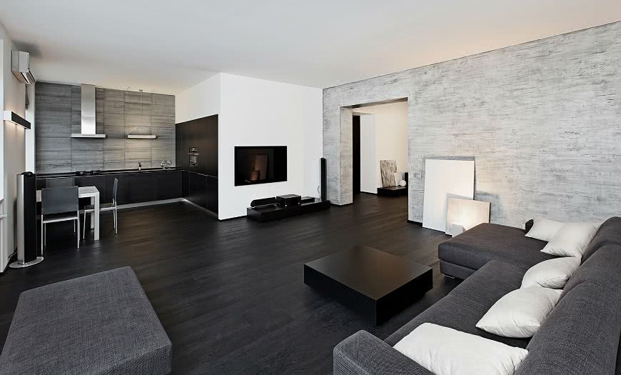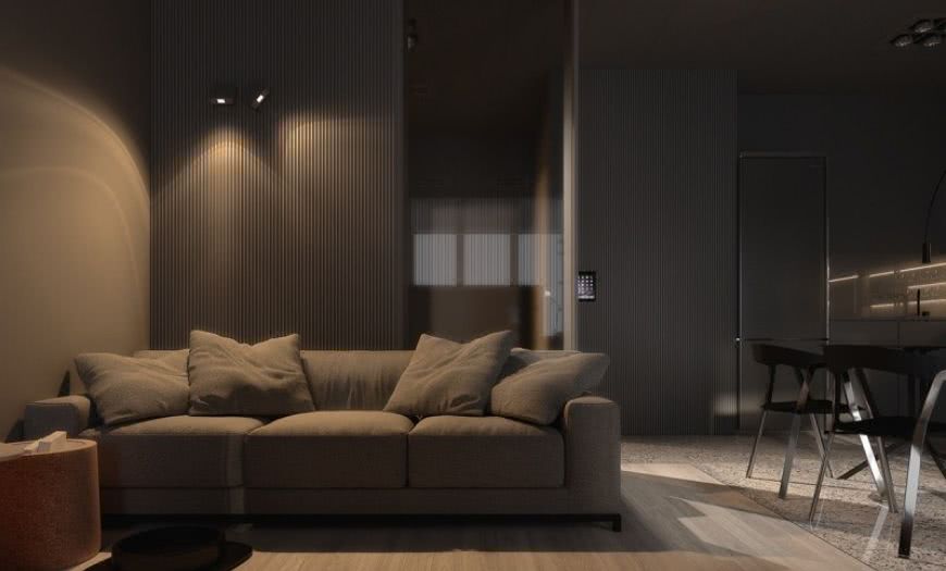 Минималистическая монохромная и не контрастная отделка стен, пола, потолка дает неограниченную свободу выбора и размещения модульной мебели, встроенных шкафов, трансформеров.