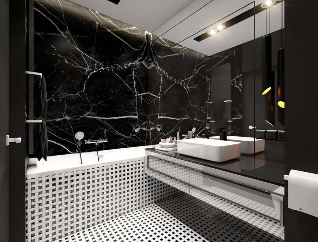 Тем не менее, важно применять это правило с определенной долей креативности и собственного творчества — это не значит, что темных цветов следует избегать, как огня. Однако, безусловно, лучше придать им роль акцента, например, в виде темно-синего рисунка на белой плитке, чем использовать их на всей поверхности пола