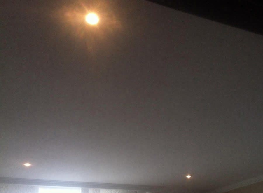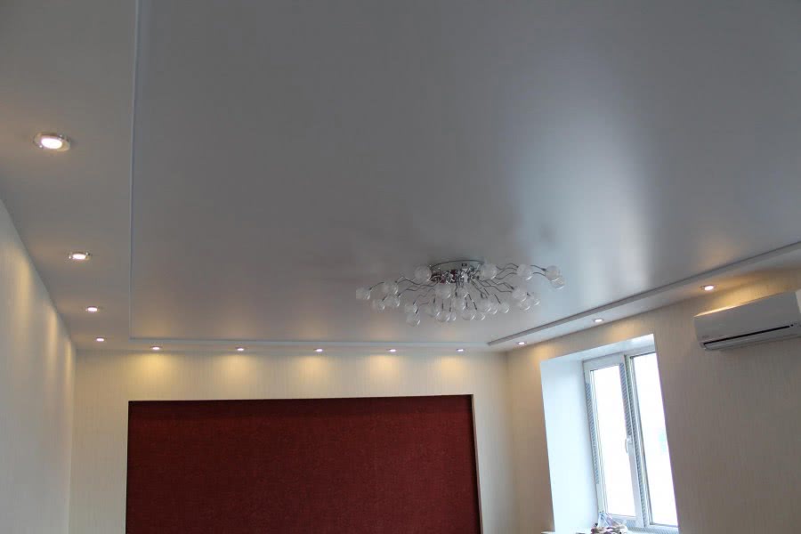 Если же осветительные приборы расположить ниже натяжной конструкции – освещение будет более рассеянным и равномерно распределён по всему периметру помещения.