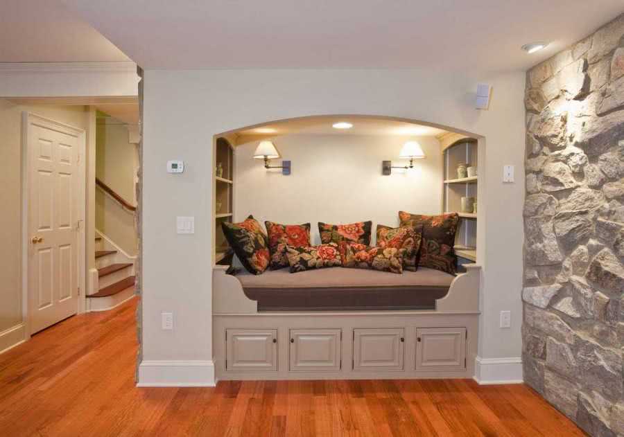 Зона отдыха в нише не отделяется по стилю от основного помещения, а становится его гармоничным продолжением.
