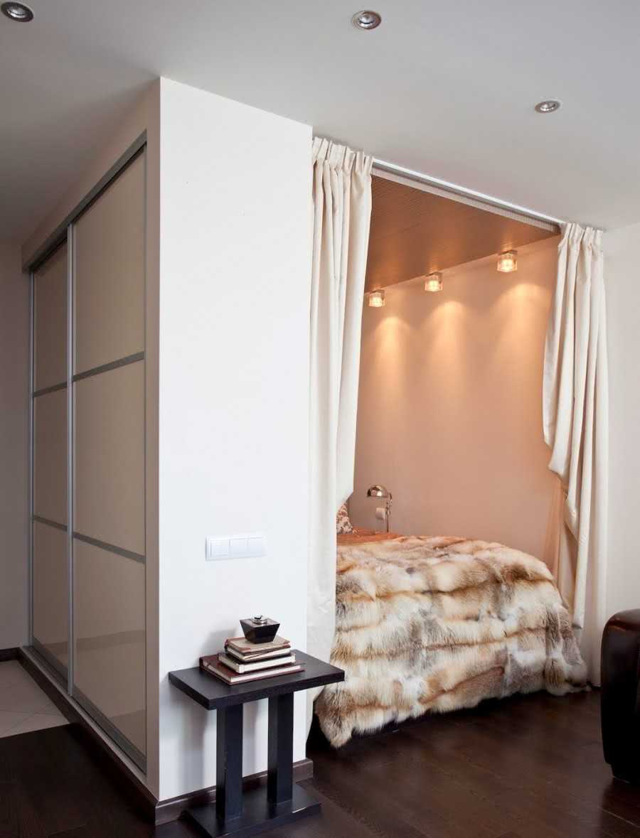 Специальное углубление в стенке однокомнатной квартиры сотни лет назад нарекли необычным словом «альков». Во времена монархов его украшали текстилем, как бы создавая пышную тканевую перегородку. Сегодня такой вариант также возможен, если альков имеет достаточную ширину – 1,7-2 м.