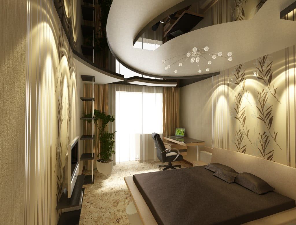 Но светлая комната выглядит намного просторнее, чем тёмная — это правило стоит вспомнить при проектировании и учитывать размер спальни. - Эксклюзивные красивые потолки можно сделать с помощью лепнины, художественной росписи, ступенчатой или многоуровневой их конструкции — всё зависит от фантазии владельца.