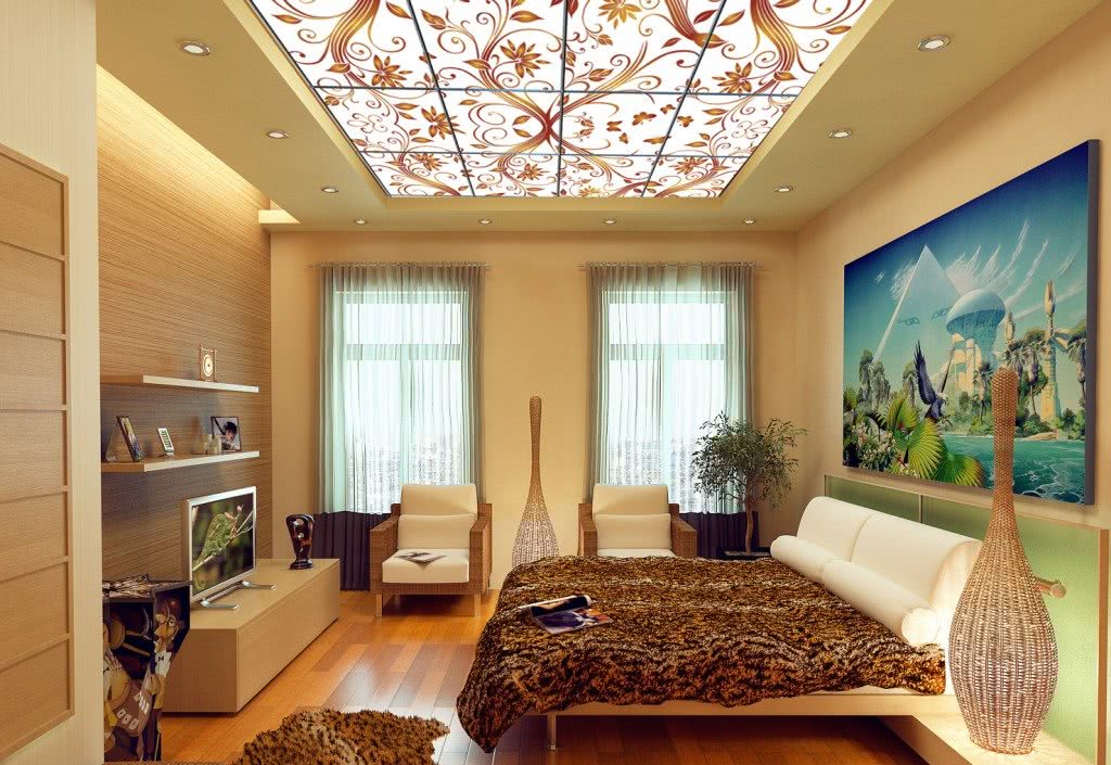 Помимо традиционного однотонного потолка интерьер спальни можно выгодно выделить использованием: