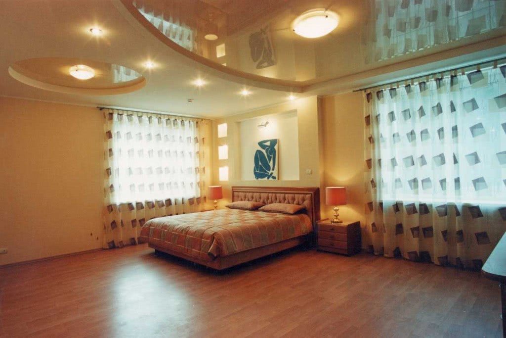 Одноуровневый вариант применим преимущественно в квартирах с обычным по высоте потолком (2,5-2,7 м). Данные конструкции уместны в небольших по площади спальнях (порядка 12-18 кв. м) городских квартир и небольших частных домов либо дач. Одноуровневые конструкции отличаются легкостью, в большинстве случаев отличаются наличием молдинга либо потолочного плинтуса по периметру потолка спальни.