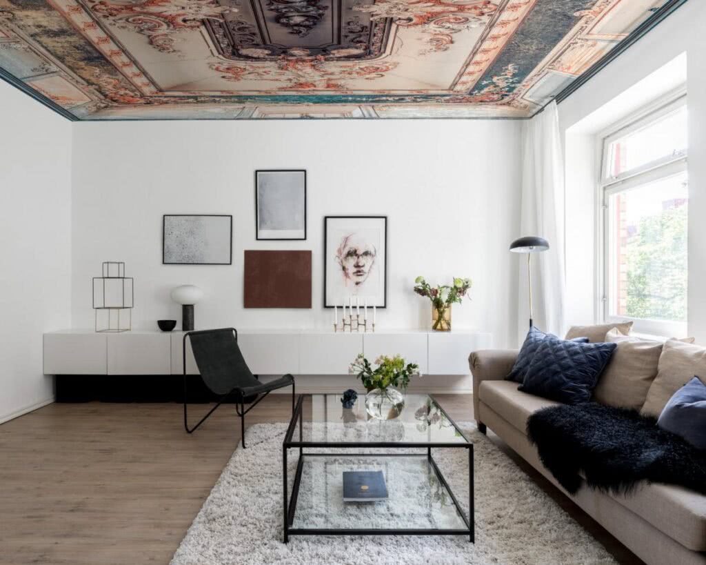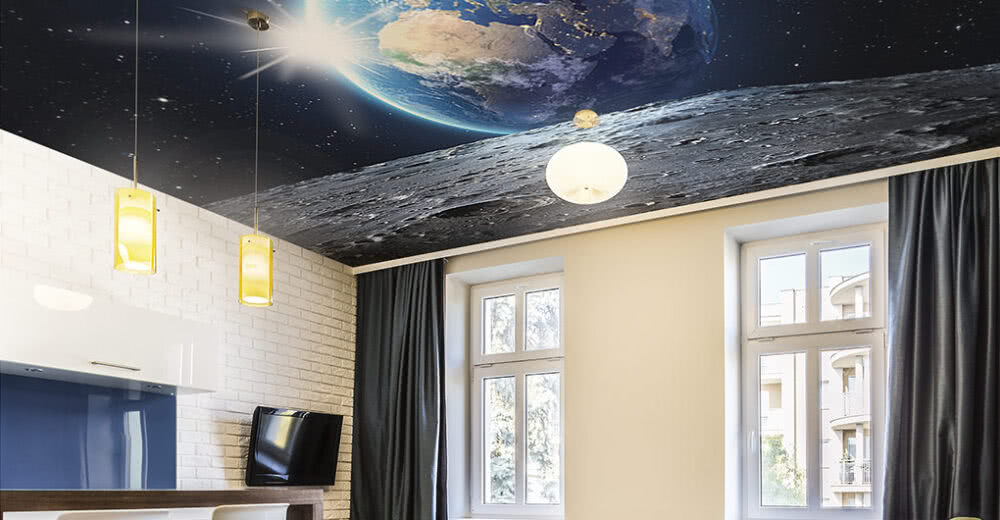 Интересной идеей оформления потолка могут стать обои или фотообои. Широкоформатная отделка придаст потолку гостиной неординарный характер. Важно правильно выбрать тему. Фотообои с изображением планет или солнечной системы станут хорошим вариантом для потолка в гостиной. Еще одно решение — фотообои на тему неба: здесь можно использовать приглушенные цвета облаков или ярко-красные восходы и закаты.