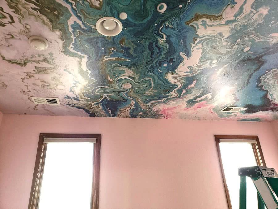 Сочетание разных фактур и цветов на потолке сделает комнату оригинальной и необычной