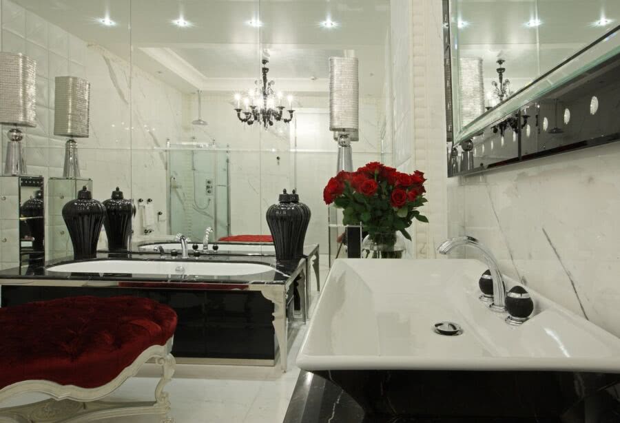 | Классика | Здесь обязательно используют позолоченный оттенок. Не обходятся без барельефов, вензелей, бронзы, мозаики. Если есть окно, то его оформляют витражом. Мозаичную или пиксельную плитку используют для облицовки стены вдоль ванны. Стараются практиковать только пастельные оттенки палитры. |